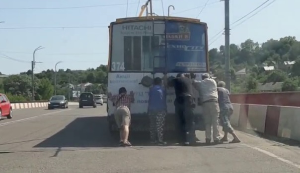 У Чернівцях на мосту через Прут поблизу Калинівського ринку зупинився тролейбус. Щоби він знову зрушив із місця, п’ятеро пасажирів вийшли його штовхати.