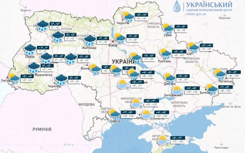 Дощ, вночі подекуди з мокрим снігом, у західній частині з переходом у сніг, (в Карпатах значний сніг), у південній частині без істотних опадів.