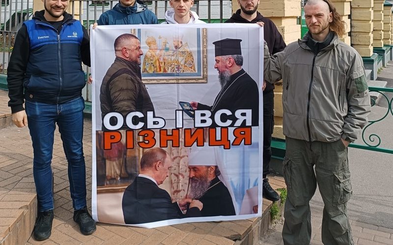 Юрій Аксенин разом із однодумцями тримав плакат, на якому були дві різні світлини. На першій головнокомандувач ЗСУ генерал Валерій Залужний вручає нагрудний знак “За сприяння війську” предстоятелю Православної церкви України митрополиту Київському і всієї України Епіфанію.