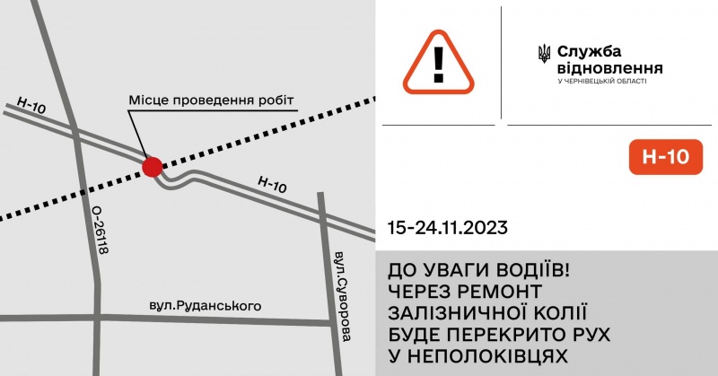 З 15 по 24 листопада стартує реконструкція залізничної колії, що у селищі Неполоківці Чернівецького району. У зв’язку із цим буде тимчасово перекрито рух транспорту через залізничний переїзд, що на 208 кілометрі дороги Н-10 Стрий – Івано-Франківськ – Чернівці – Мамалига (на Кишинів).